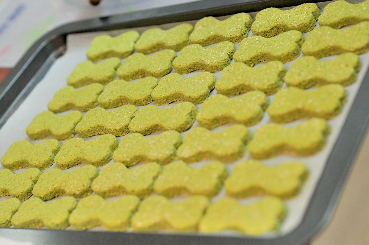 3. Using an ice cream scoop, scoop portion of mixture out and press into bone cookie pan.